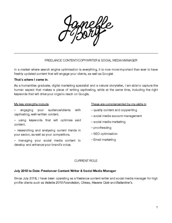 Janelle Borg is an experienced content writer and social media manager with a demonstrated history of working in the creative industries. She has written a range of content, such as SEO copy, blog articles, social media content, PR campaigns, EDMs, press releases, reports, and ebooks. Her past clients include BPC Marketing Agency, Chivas, Ballantine’s, Jameson, Havana Club, J&C Pisani, Wedango, Trackage Scheme, Evently, Loud Women, Get in Her Ears, Revitalise Brighton & Hove, and Future Content.