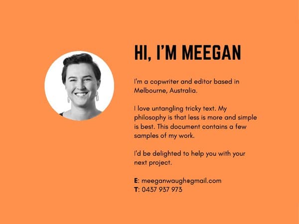 Meegan Waugh is a professional copywriter and content specialist with experience working with a range of clients across industries, including education, government, fashion, retail, recruitment, and law. She has written and edited content for print publications, websites, social media, bids and tenders, and marketing collateral. Her past clients include Charles Sturt University, Department of Health and Human Services, and Swinburne University.