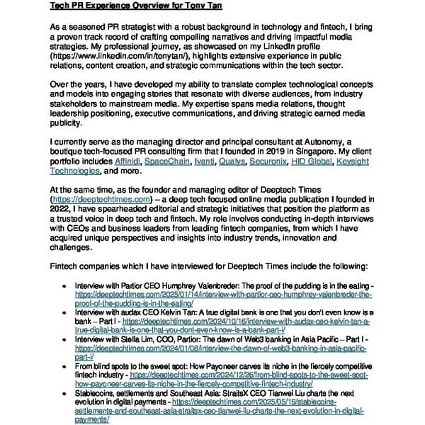 Tony Tan is a communications and tech PR professional with over 20 years of experience across leading agencies including Weber Shandwick, Havas Worldwide, and MSLGroup. He specialises in five core innovation sectors, including financial services (fintech), deep technologies, healthcare and wellness, lifestyle and public sector. Tony has experience securing media coverage in major outlets such as The Edge Singapore, BBC World News TV, Fortune Magazine, Nikkei Asia, and Money FM 89.3 (Radio). He has advised blue-chip multinational technology corporations on public relations strategy, regional media and analyst relations, and C-level communications. At Weber and Havas, he led multi-market campaigns and customer advocacy programmes for brands such as Alipay, Ericsson, Red Hat, Philips, and Motorola Solutions. He has provided senior counsel on corporate messaging, thought leadership, and reputation management, and worked closely with executives to support APAC-wide visibility efforts.