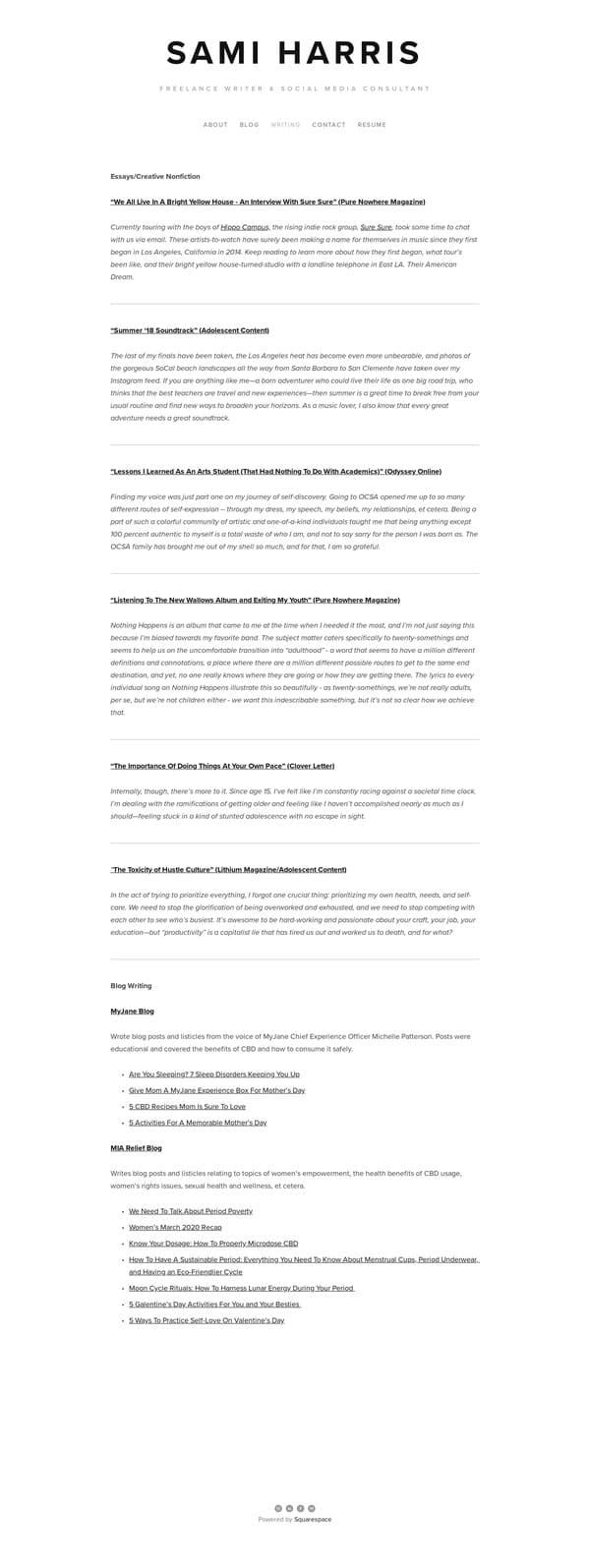 Sami Harris is a writer, social media consultant, and interdisciplinary artist with over five years of experience specializing in branding and content creation. As a social media manager for a mental health-oriented app BunchMate, she has written social media copy, proofread written content, designed social media graphics, and tailored all content to BunchMate’s target demographic. She also has experience working in social media roles at companies including MyJane, Groupie U, and Nordstrom. As a writer and editor, Sam has bylines in Pure Nowhere, Adolescent Content, Clover Letter, Lithium Magazine, Odyssey Online, Polemical Zine, and Always In A Funk. Her skills also include Photoshop, Lightroom, and Canva.